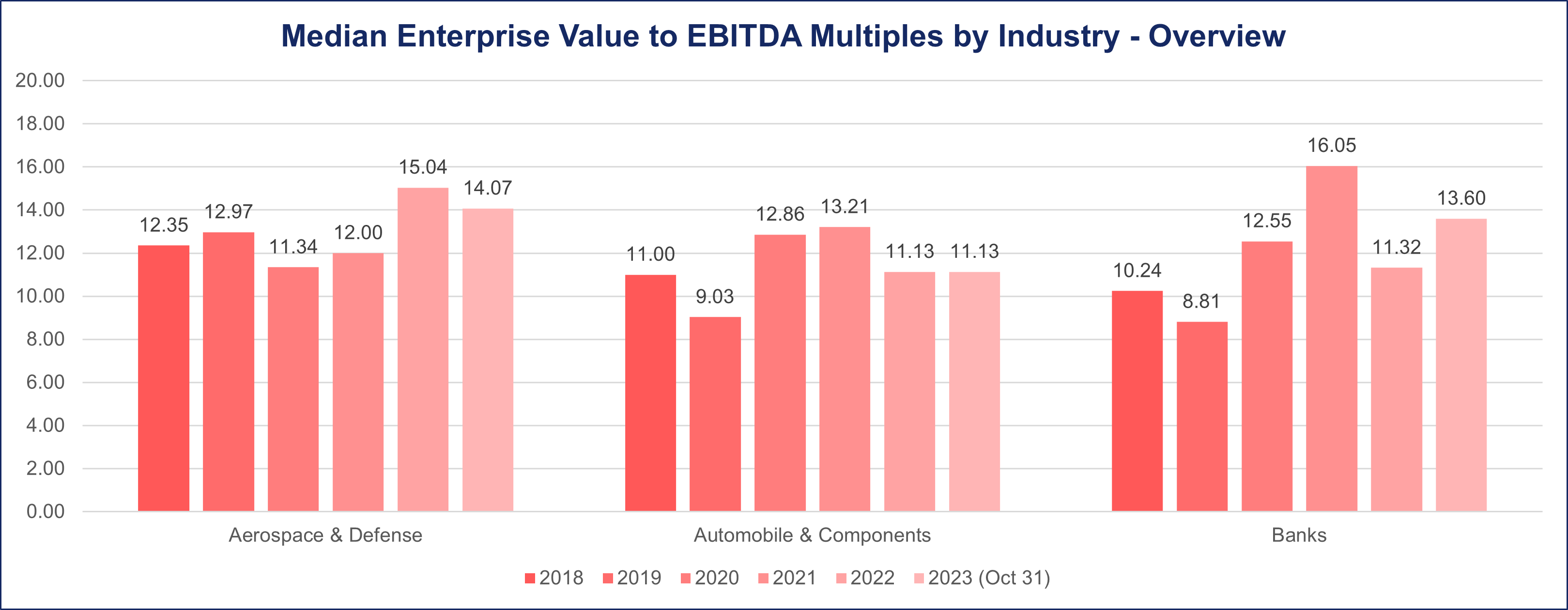 Notwithstanding the setbacks encountered during the pandemic, the Aerospace & Defense sector demonstrated resilience by rebounding with an elevated median multiple of 15 in 2022. As of October 2023, the industry’s median deal multiples stand at 14.1, reflecting a sustained recovery and resilience in the market.