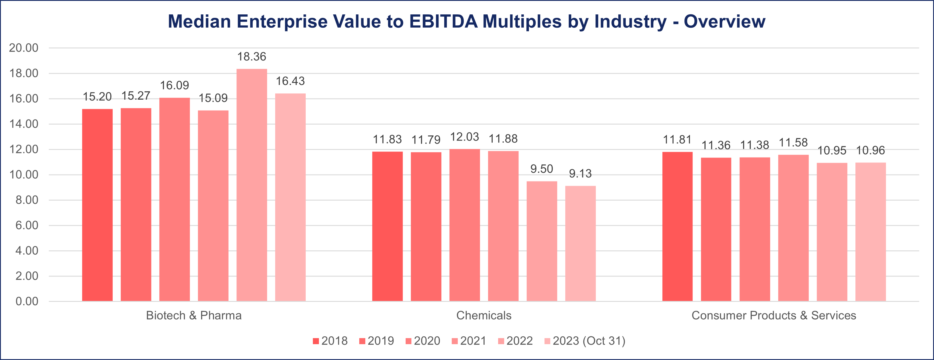 During the 2018-2019 period, the Biotech and Pharma industry consistently demonstrated strong median deal multiples of 15, as measured by the EV/EBITDA metric.