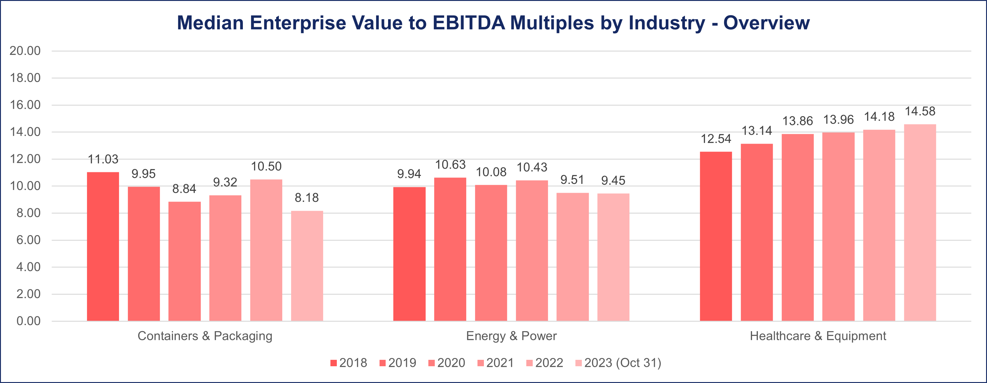 During the pre-pandemic years of 2018 and 2019, the Containers and Packaging sector demonstrated a median deal multiple of 11 and 10, respectively, based on the (EV/EBITDA) metric.