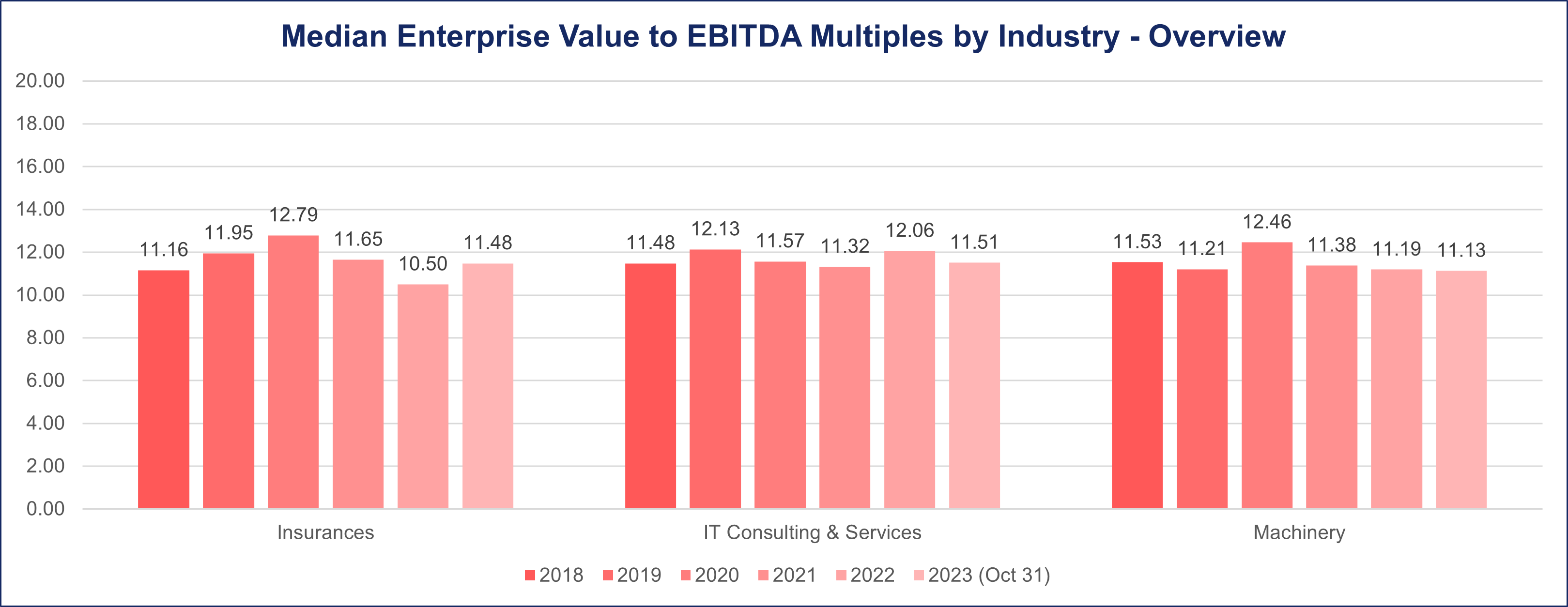 As we transitioned into the post-pandemic landscape from 2022 to October 2023, the median multiple adjusted to 11.13, indicating a potential stabilization or realignment in the industry’s valuation landscape.