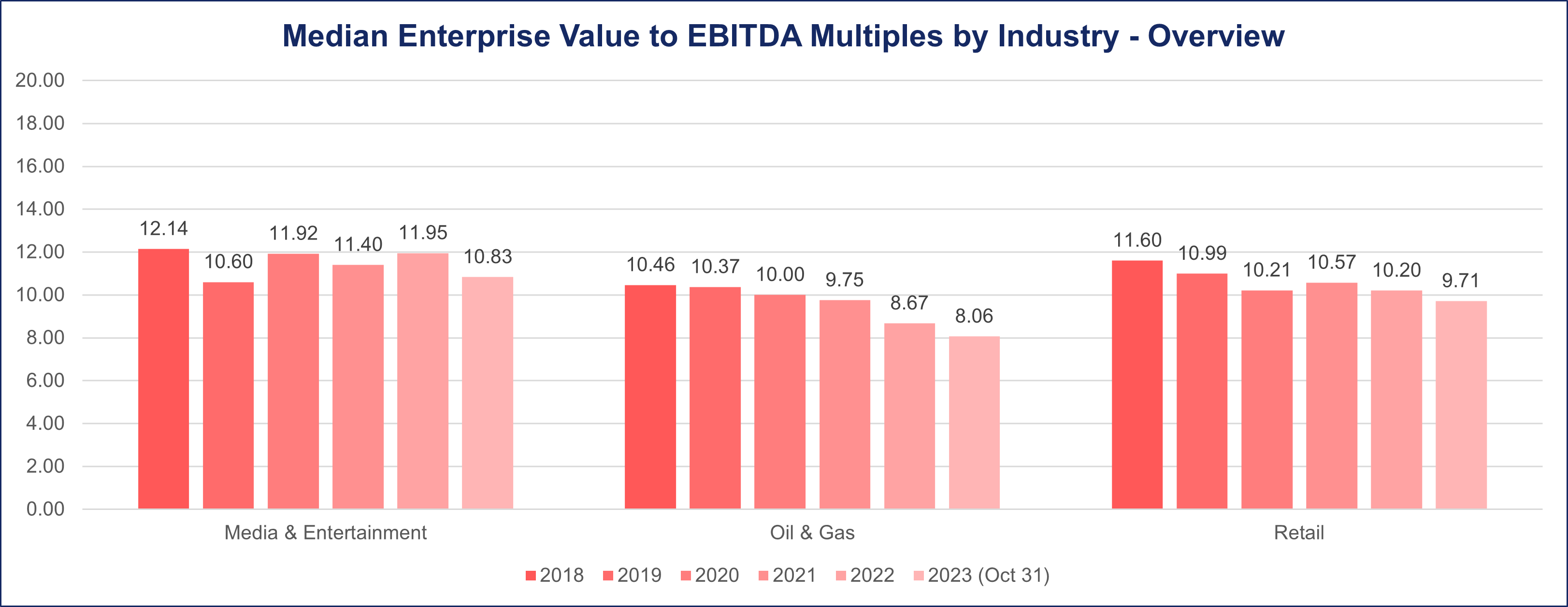 In the pre-pandemic era spanning 2018-2019, the Oil & Gas industry maintained a consistent median deal multiple of 10.4 when assessed through the Enterprise Value to EBITDA (EV/EBITDA) metric.