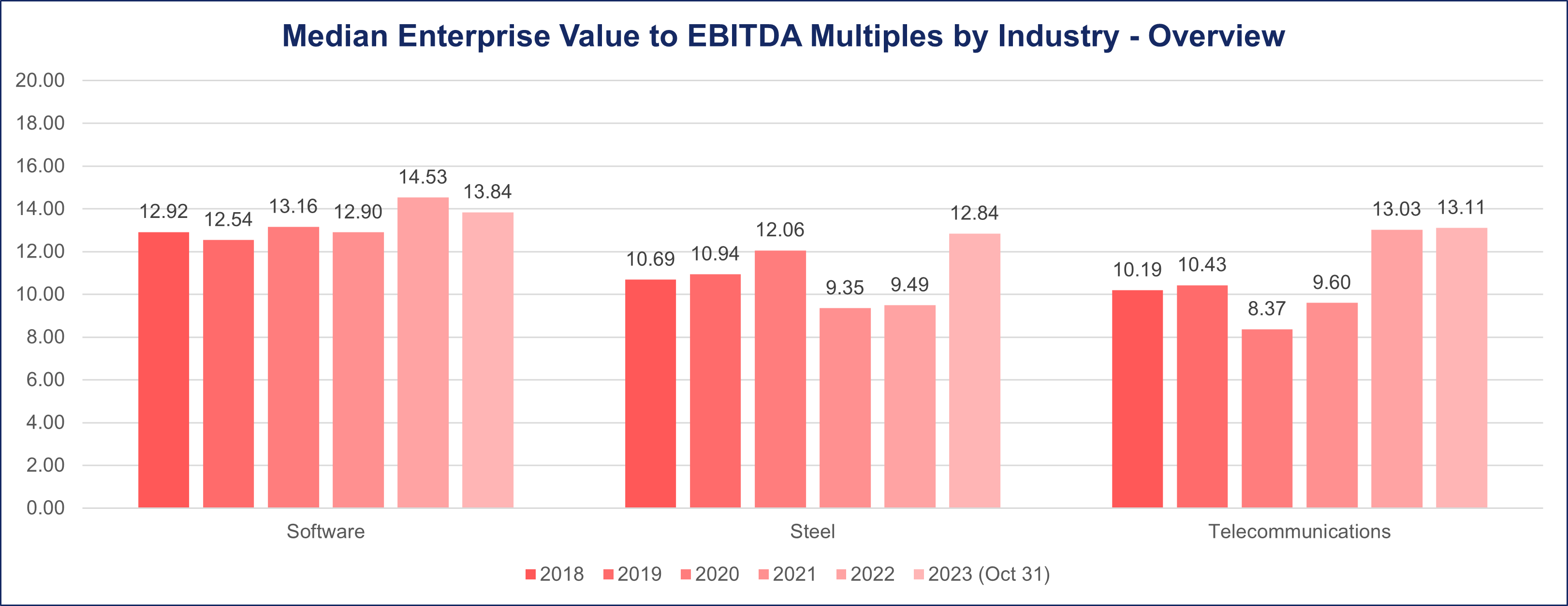 Despite the setbacks during the pandemic, the Telecommunications sector showcased resilience. As of October 2023, there has been a notable rebound, with the median multiple reaching an elevated level of 13.