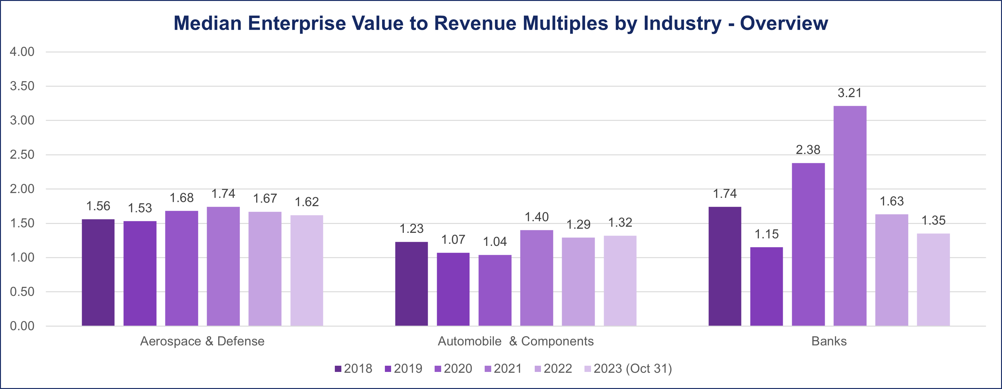 A discernible and consistent pattern emerges when analyzing the EV/Revenue metric. In the pre-pandemic phase spanning 2018-2019, the median deal multiple stands at 1.5. The pandemic era (2020-2021) witnessed a subtle shift, with the deal multiple slightly increasing to 1.7. Impressively, post-pandemic, the Aerospace & Defense industry maintains stability, demonstrating resilience as the deal multiples settle at 1.6 from 2022 to October 2023.