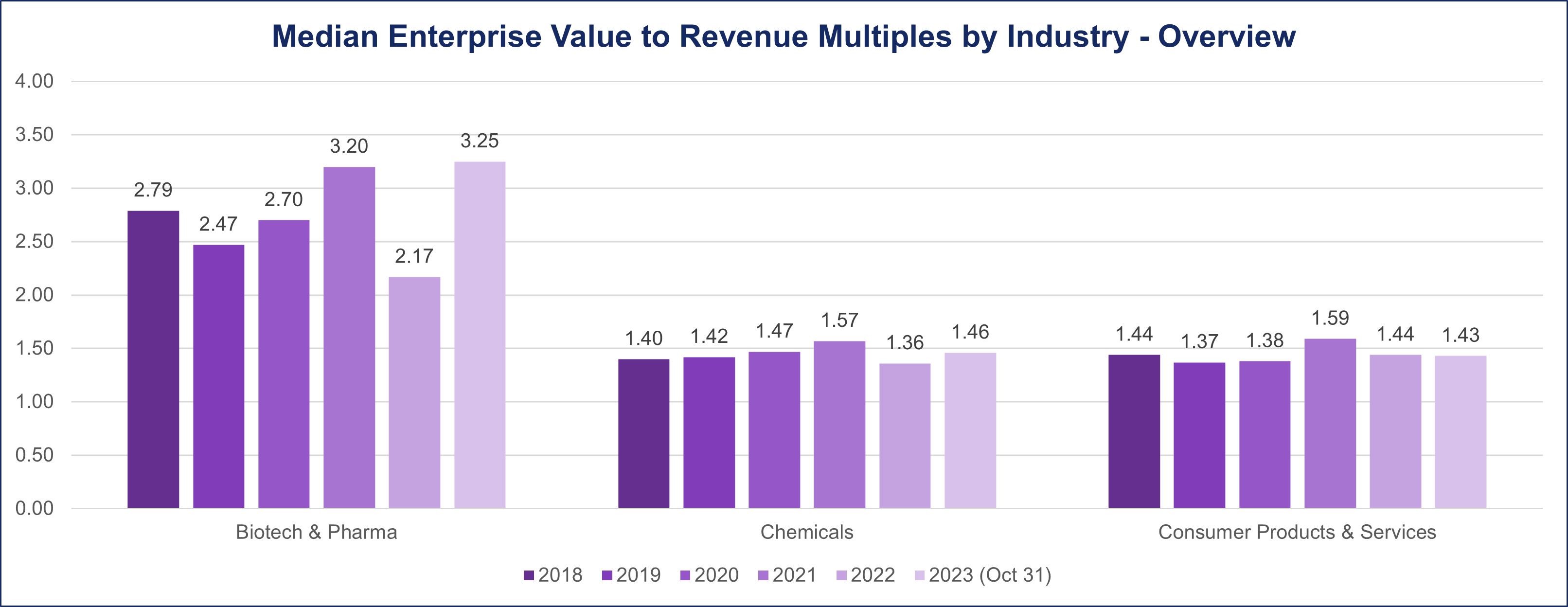 A discerning analysis of the EV/Revenue metric unveils noteworthy fluctuations in deal multiples over the years. From 2018 until the onset of the pandemic in 2020, the median deal multiples consistently hovered within the range of 2.5 to 2.7. Notably, the Biotech & Pharma sector witnessed an upswing in 2021, reaching a median deal multiple of 3.2.