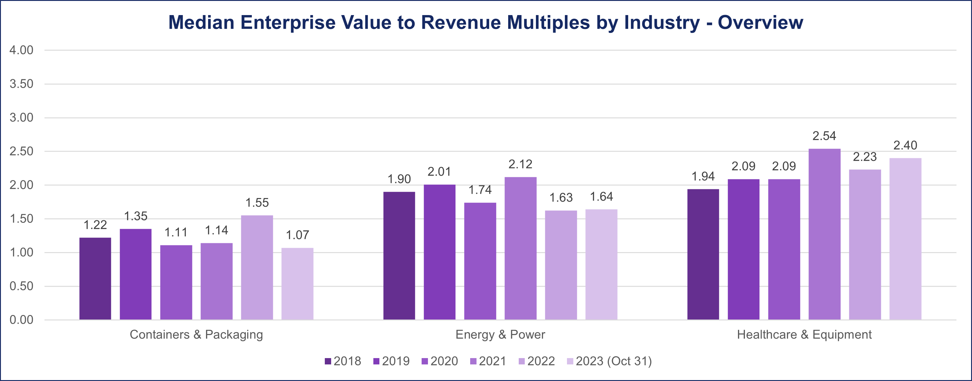During the period spanning from 2018 to the onset of the pandemic in 2020, the Healthcare Equipment & Supplies sector consistently maintained median deal multiples within the range of 1.9 to 2.1. However, a notable shift occurred in 2021, witnessing a surge in deal multiples to 2.54.