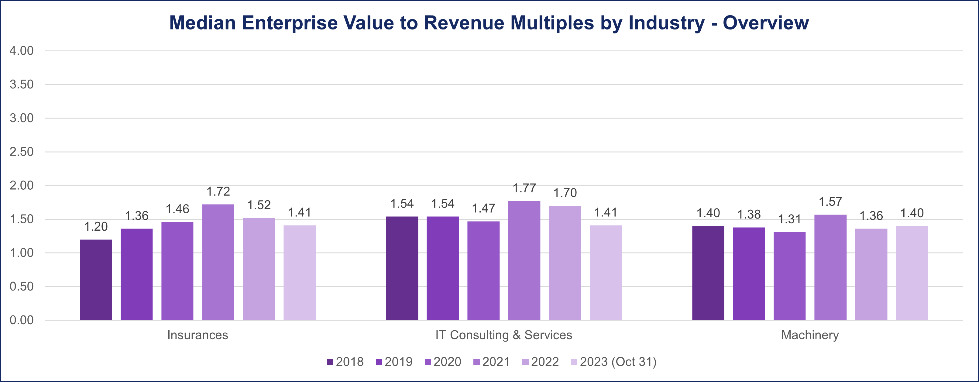 The post-pandemic phase witnessed a subsequent adjustment in these metrics, indicating a downward trend. In 2022, the median deal multiples decreased to 1.6 and continued to settle at 1.4 as of October 2023.