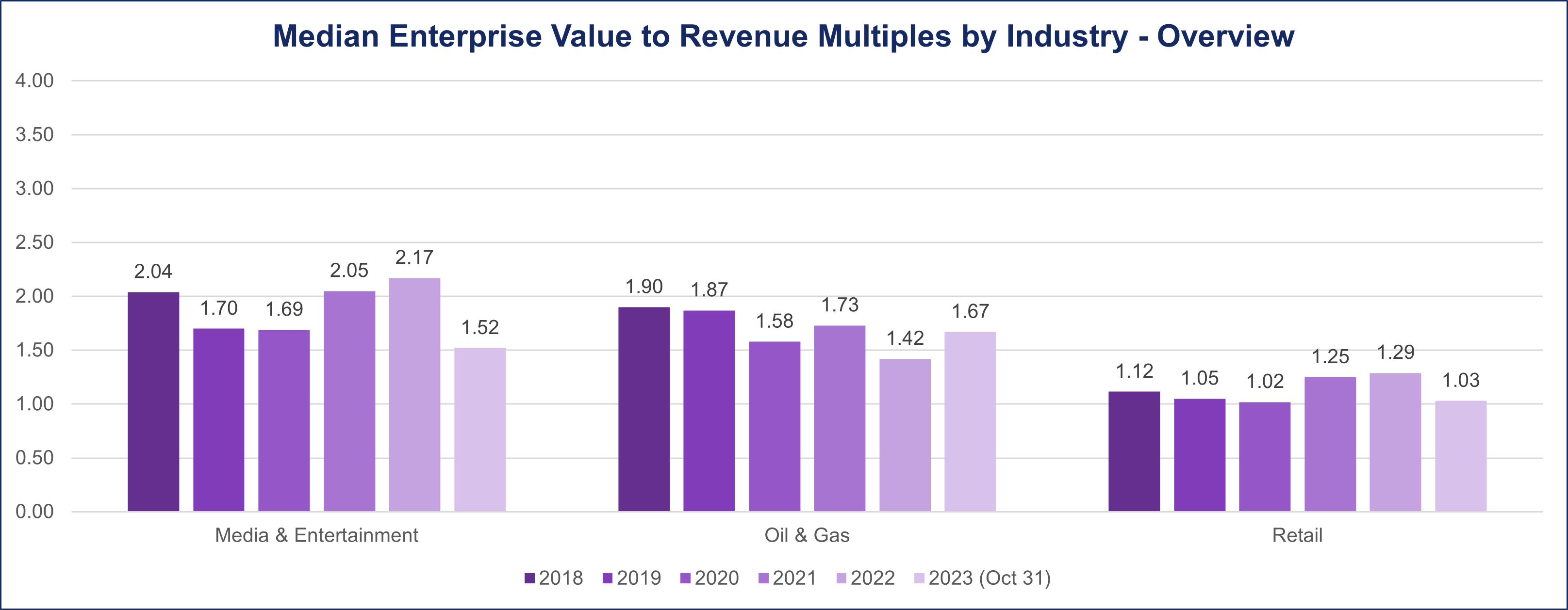 In the pre-pandemic period of 2018-2019, the median deal multiples were 1.96 and 1.88, respectively. As the pandemic unfolded in 2020, there was a slight contraction, with the median deal multiple dipping to 1.6. However, by 2021, the sector exhibited resilience, bouncing back to reach a peak in deal multiples median of 2.15. In the post-pandemic landscape, the industry displayed stability, with deal multiples consistently settling at 1.9 from 2022 to October 2023.