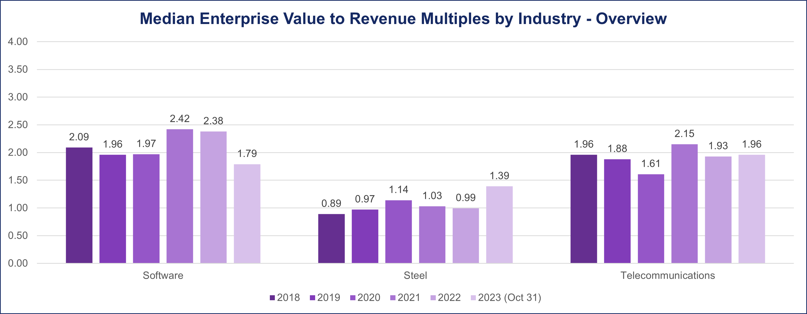 During the pre-pandemic years of 2018-2019, the Steel industry exhibited a median deal multiple, as measured by the EV/Revenue metric, of 0.89 and 0.97, respectively. Notably, this metric experienced a modest uptick during the pandemic in 2020, reaching 1.1. From 2021 transitioning into the post-pandemic landscape, the deal multiple stabilized at 1. However, as of October 2023, a discernible shift is evident, with the median deal multiple for the Steel Sector now elevated to 1.4.