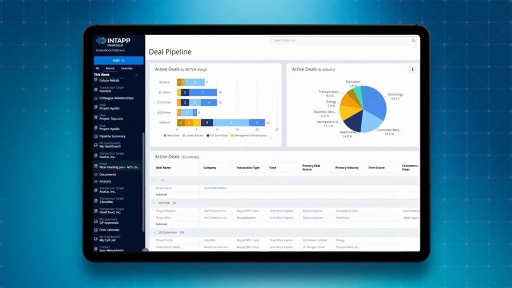 An extensive view of Intapp DealCloud deal pipeline dashboard which include projects, documents, progress reports | Source: intapp.com/dealcloud
