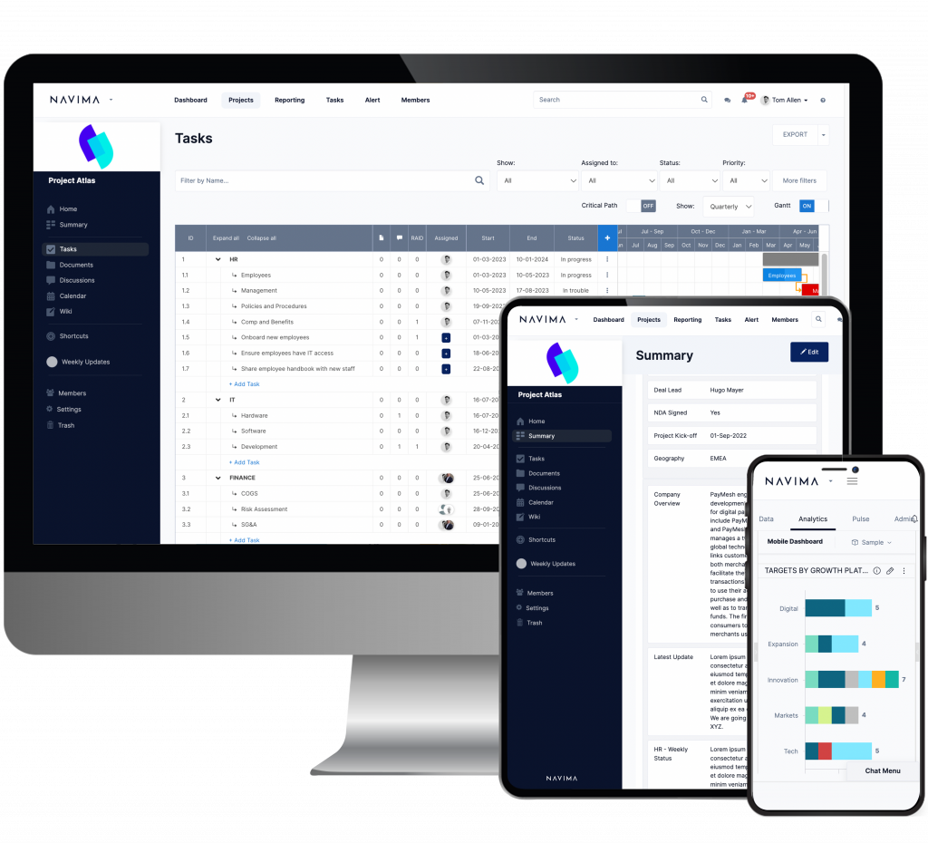 Navima® emerges as the smart approach to navigating the M&A landscape. Designed exclusively for M&A endeavors, Navima is an all-encompassing platform that empowers teams to harmonize efforts, steer deals, and craft blueprints for repeatable triumphs. By spanning the gamut of buy-side, sell-side, and alliances, Navima fuels heightened deal momentum, ushers in uniformity to M&A ventures, and champions data-driven choices. Within its secure cloud repository, documents, playbooks, tasks, and reports coexist seamlessly, eradicating bottlenecks and fragmentations of the past.